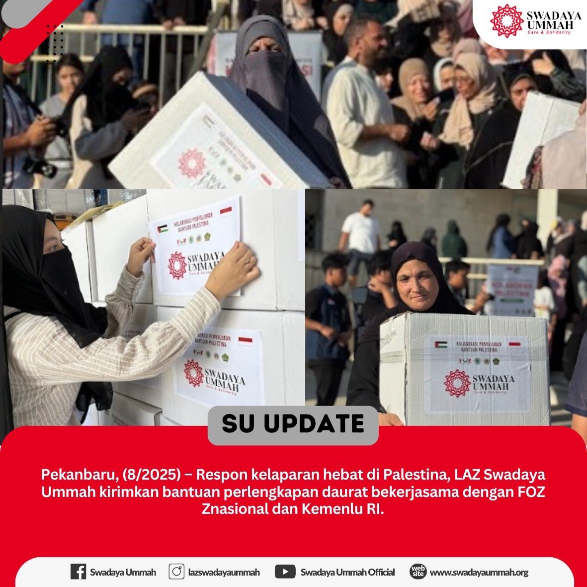 Alhamdulillah, atas izin Allah dan setelah melalui proses yang panjang di tengah konflik Palestina, akhirnya pada bulan Agustus 2025, LAZ Swadaya Ummah kembali menunjukkan komitmennya dalam aksi kemanusiaan global dengan menyalurkan bantuan darurat untuk rakyat Palestina yang tengah mengalami krisis berkepanjangan. Bantuan ini merupakan hasil sinergi antara LAZ Swadaya Ummah, Forum Zakat (FOZ), dan Kementerian Luar Negeri Republik Indonesia.
